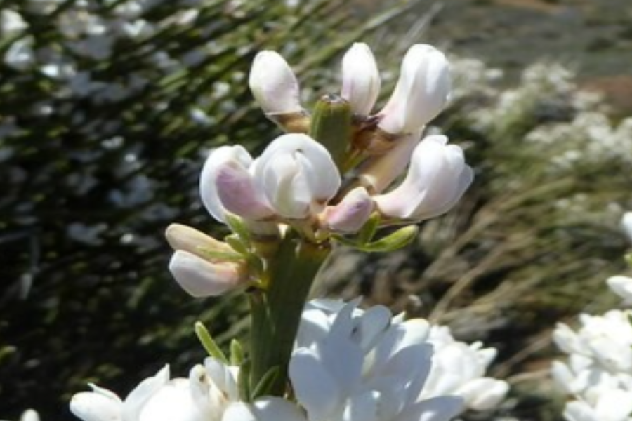 De bloemen komen overvloedig voor en zijn opvallend en wit. Het zijn groepen van kleine bloemen die op een klokvormige wijze bij elkaar staan.