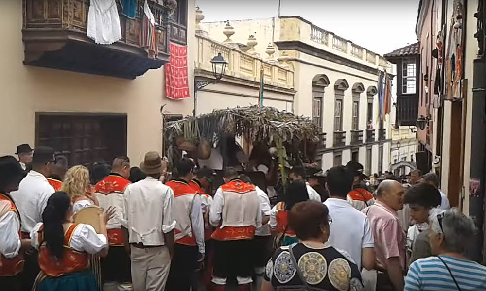 Met zo´n 90 door ossen getrokken karren gaat de romeria van La Orotava↗ van Plaza Cruz del Teide naar het Plaza de La Paz in de wijk El Calvario waarbij de optocht begeleid wordt door rondala's, zang-, dans-, en folkloregroepen tezamen met duizenden feestelijk geklede pelgrims in de lokale traditionele klederdracht